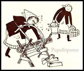 katkoi hellapuita. Kulunut hameenhelma siellä vain lupsahteli työn tahdissa.